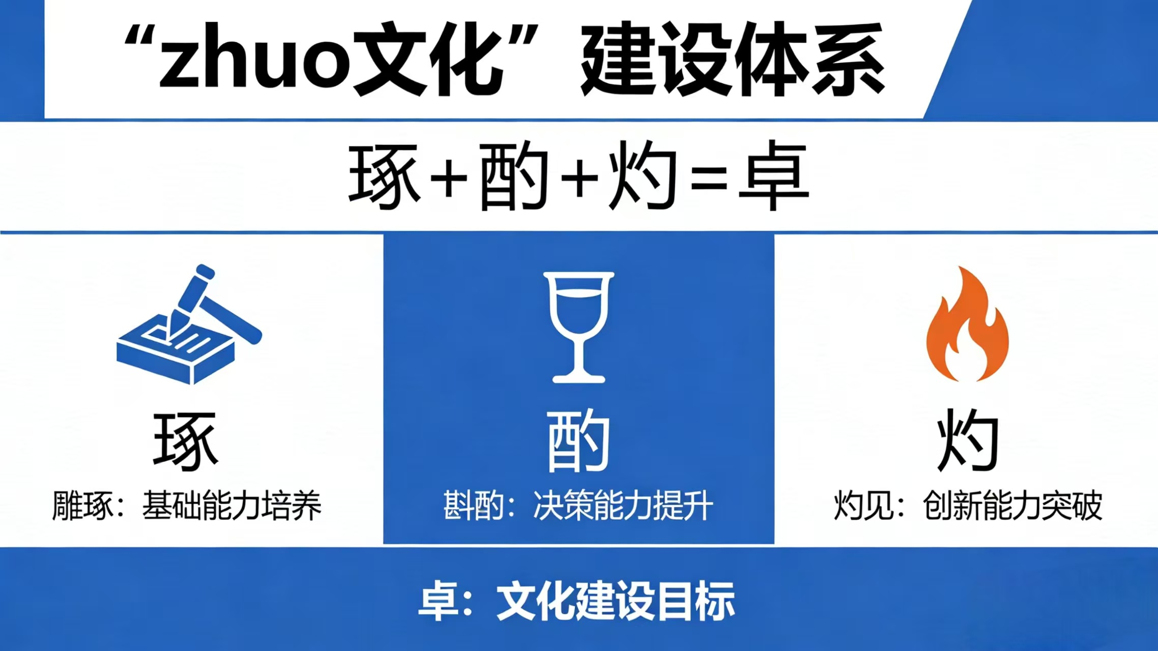 “zhuo文化”由“琢”“酌”“灼”三个核心维度构成,三者环环相扣、层层递进,最终指向“卓”的发展目标,形成独具特色的教师专业成长文化生态。