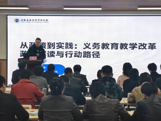 参观结束后,安徽省教科院基础教育研究所所长吴桥以《从政策到实践:义务教育教学改革政策解读与行动路径》为题开展专题讲座。吴所长围绕义务教育教学改革的核心政策要点,结合典型案例深入剖析政策落地的关键环节,从课程优化、课堂创新、评价改革等方面,为在场校长们提供了清晰的行动指引。
