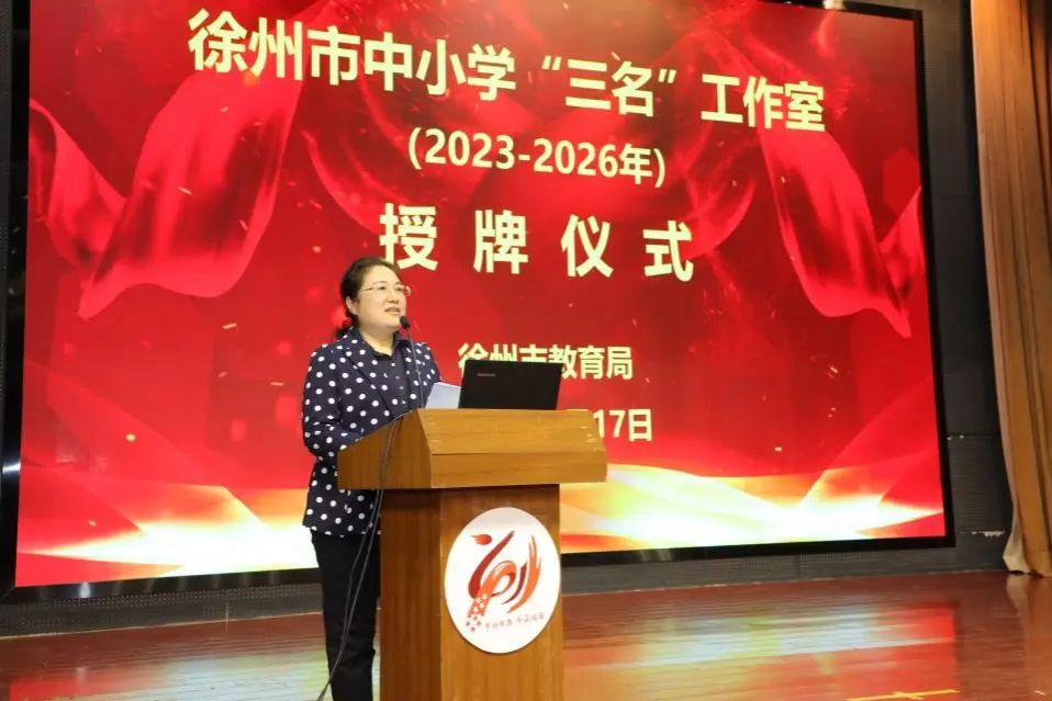 为进一步强化名师、名校长、名班主任共同体建设,充分发挥其引领孵化作用,4月17日,徐州市中小学“三名”工作室授牌仪式在江苏模特艺术学校举行。市教育局副局长刘桂云,江苏模特艺术学校校长李乐,市教育局相关处室负责同志和来自各县(市)区、局直属各学校负责名师工作室建设管理的同志,2021-2024年工作室主持人及新评选命名的2023-2026年“三名”工作室主持人等近200人参加活动。